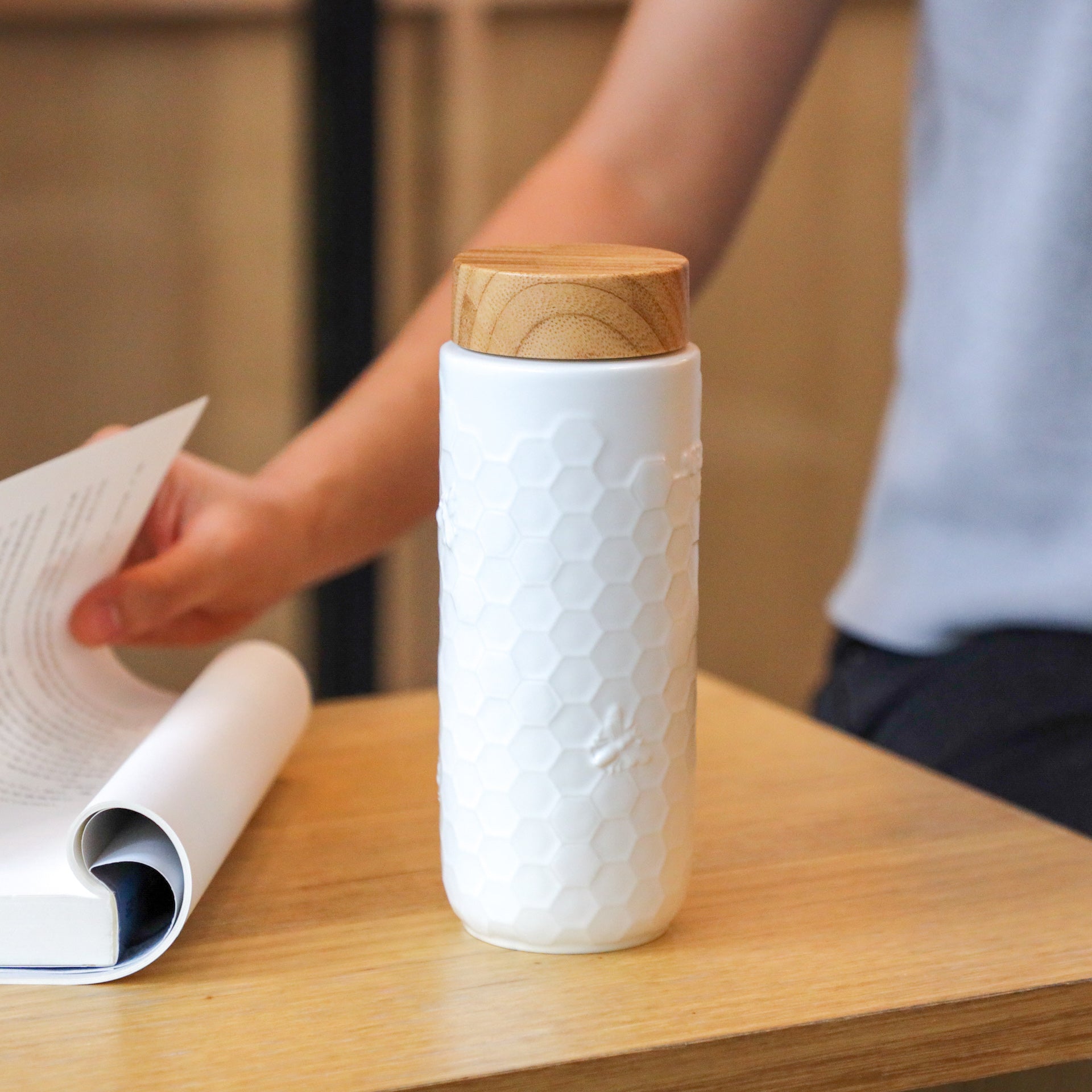 Pure Taste, Modern Style. The tourmaline lining of the ACERA Honey Bee travel mug heightens the flavor and freshness of any beverage. With a handcrafted honeycomb design, the ceramic outer layer has a unique look with its golden honey bees. Moreover, the double-wall ceramic design preserves THE heat of your favorite drink for up to 90 minutes. Finally, the ABS Tritan bamboo lid effect completes the look of this luxurious travel mug that enhances the quality of your lifestyle.