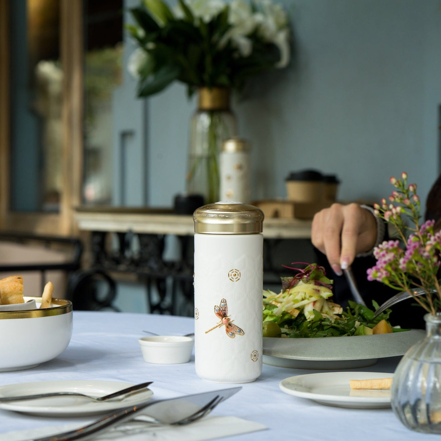 Drawing on centuries of symbolism, the dragonfly is renowned as a symbol of good fortune. Its wings' shimmering translucent qualities denote both luck and strength. Immerse yourself in the captivating beauty of the dragonfly design embellished with shimmering crystals. Each crystal exudes a peaceful ambiance, making your beverage a tranquil respite wherever you are. Opt for the exquisite combination of elegance, usability, and cultural symbolism: the ACERA LIVEN Dragonfly Serenity Travel Mug with Crystals.