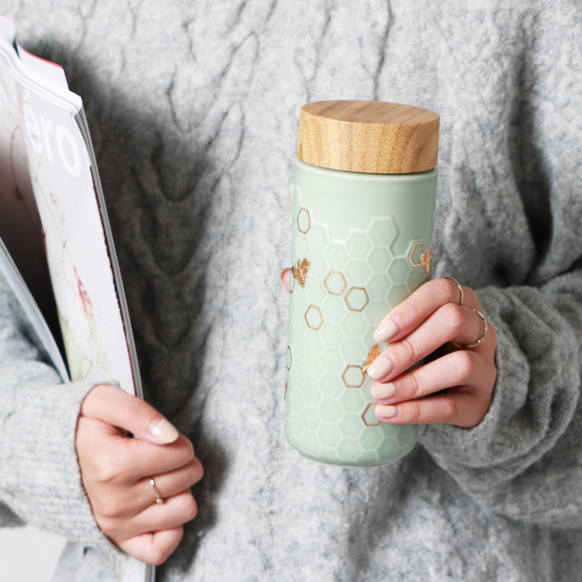 Indulge in the pure and freshness of your drink with the ACERA Honey Bee Ceramic Travel Mug, boasting a tourmaline-lined inside and a delicate, hand-crafted, and hand-painted Gold Bee and honeycomb pattern. Maintain the heat of your beverage in its double-wall ceramic build for up to 90 minutes. The look is given a touch of extravagance with an ABS Tritan bamboo lid. Every ACERA tumbler is designed with intricate designs and top-notch engraving, so you can savor the simple luxury of drinking water. Refined taste, sleek style.