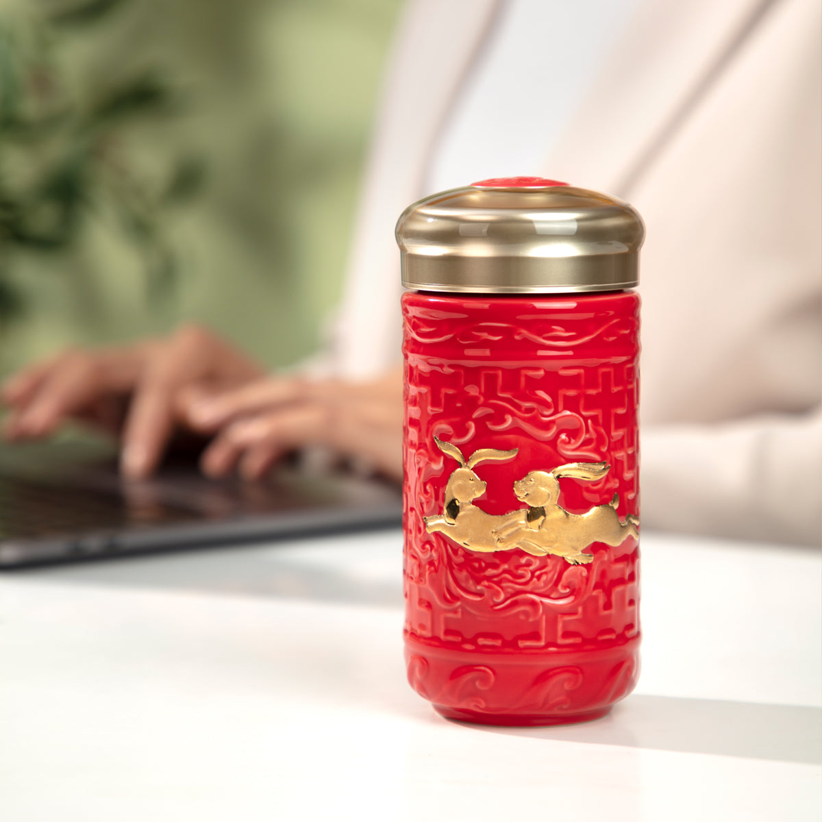The Jade Rabbit tumbler is a treat for the eyes, with a luxurious feel and a traditional design featuring two gold jade rabbits hopping across the engraved clouds.